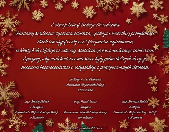 Życzenia Komendanta Wojewódzkiego Policji w Krakowie z okazji Świąt Bożego Narodzenia i Nowego Roku