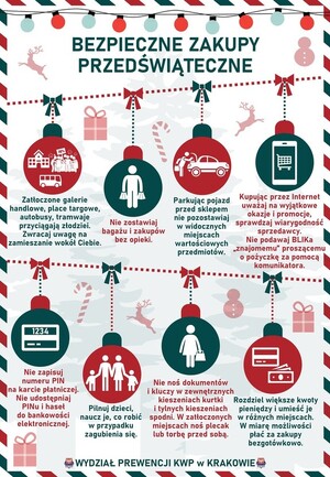 Już za parę dni Święta Bożego Narodzenia. Rozpoczęliśmy okres przygotowań, robienia zakupów, wyjazdów, panuje tzw. „przedświąteczna gorączka”. Koniecznym jest jednak abyśmy nie zapominali o przestrzeganiu podstawowych zasad bezpieczeństwa, które uchronią nas przed działaniem przestępców. Po niżej przedstawiamy kilka przydatnych rozwiązań, aby okres świąteczny upłyną w przyjemnej atmosferze, bez niepotrzebnego stresu i wyrzutów sumienia.