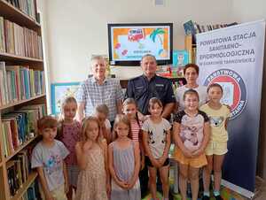 Dąbrowscy policjanci zajmujący się profilaktyką społeczną wspólnie z pracownikiem Sanepidu w ramach akcji „Bezpieczne Wakacje 2024” spotkali się z dziećmi i młodzieżą w Gminnej Bibliotece Publicznej w Gręboszowie. Wizyta miała na celu uświadomienie najmłodszym, jak ważne jest bezpieczeństwo w życiu codziennym, a zwłaszcza podczas letniego wypoczynku.
