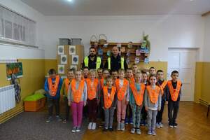 - Lekcja bezpieczeństwa w ruchu drogowym Policjanci z dąbrowskiej drogówki odwiedzili dzieci ze Szkoły Podstawowej w Nieczajnej Górnej oraz Ochronki w Dąbrowie Tarnowskiej. Funkcjonariusze tłumaczyli jak należy prawidłowo zachowywać się na drodze, aby być bezpiecznym. Pierwszaki dowiedziały się jaki wpływ na ich bezpieczeństwo mają elementy odblaskowe, w które mundurowi na końcu spotkania je wyposażyli. Natomiast najmłodsi mogli zobaczyć jak wyposażony jest do służby policjant i poczuć się jak on siedząc na miejscu kierowcy radiowozu służbowego.
